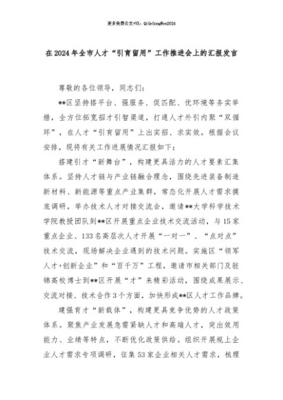 【七哥公文】2024年:在2024年全市人才“引育留用”工作推进会上的汇报发言+更多免费公文+VX:QiGeGongWen2024