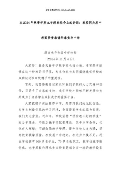 【七哥公文】2024年:在2024年秋季学期九年级家长会上的讲话:家校同力助中考圆梦青春谱华章竞存中学+更多免费公文+VX:QiGeGongWen2024
