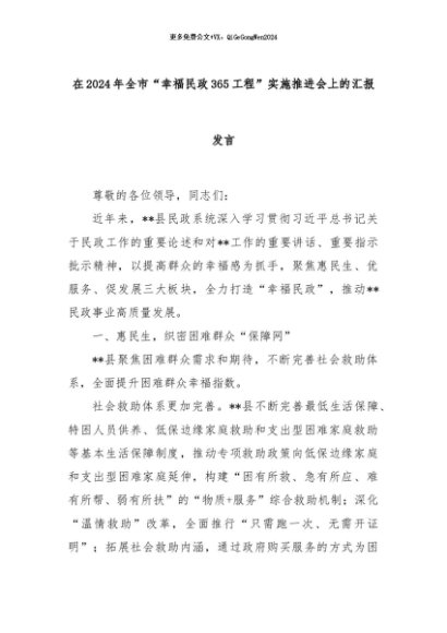 【七哥公文】2024年:在2024年全市“幸福民政365工程”实施推进会上的汇报发言+更多免费公文+VX:QiGeGongWen2024