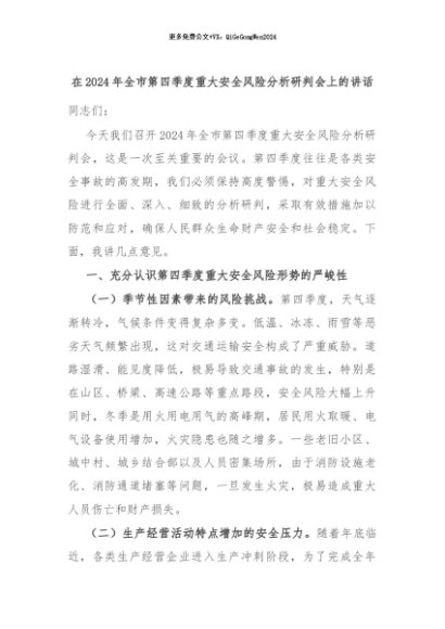 【七哥公文】2024年:在2024年全市第四季度重大安全风险分析研判会上的讲话+更多免费公文+VX:QiGeGongWen2024