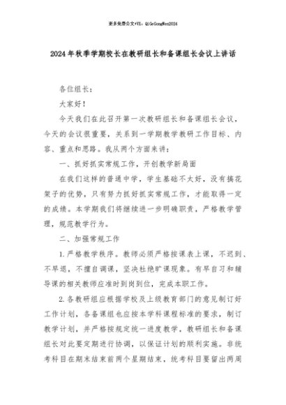 【七哥公文】2024年:2024年秋季学期校长在教研组长和备课组长会议上讲话+更多免费公文+VX:QiGeGongWen2024