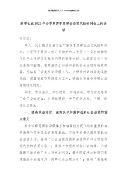 【七哥公文】2024年:副市长在2024年全市第四季度综合治理风险研判会上的讲话+更多免费公文+VX:QiGeGongWen2024