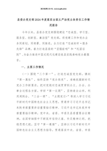 【七哥公文】2024年:县委办党支部2024年度落实全面从严治党主体责任工作情况报告+更多免费公文+VX:QiGeGongWen2024
