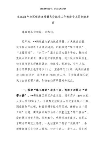 【七哥公文】2024年:在2024年全区促进高质量充分就业工作推进会上的交流发言+更多免费公文+VX:QiGeGongWen2024