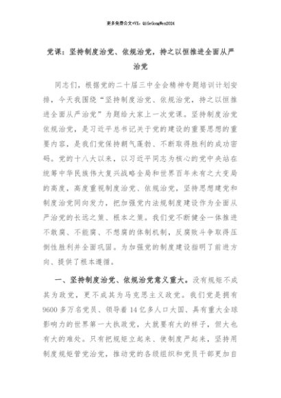 【七哥公文】2024年:党课:坚持制度治党、依规治党,持之以恒推进全面从严治党+更多免费公文+VX:QiGeGongWen2024