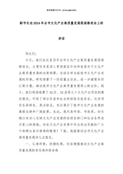 【七哥公文】2024年:副市长在2024年全市文化产业高质量发展现场推进会上的讲话+更多免费公文+VX:QiGeGongWen2024