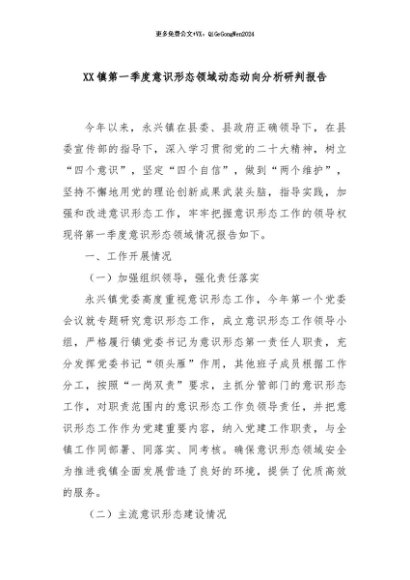 / 【七哥公文】2024年:XX镇第一季度意识形态领域动态动向分析研判报告+更多免费公文+VX:QiGeGongWen2024
