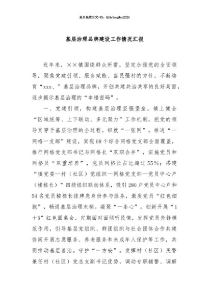 / 【七哥公文】2024年:基层治理品牌建设工作情况汇报+更多免费公文+VX:QiGeGongWen2024