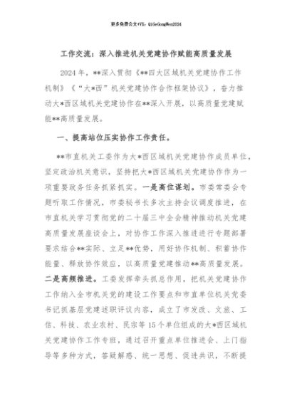 / 【七哥公文】2024年:工作交流:深入推进机关党建协作赋能高质量发展+更多免费公文+VX:QiGeGongWen2024