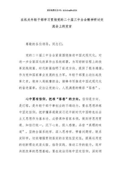 【七哥公文】2024年:在机关年轻干部学习贯彻党的二十届三中全会精神研讨交流会上的发言+更多免费公文+VX:QiGeGongWen2024