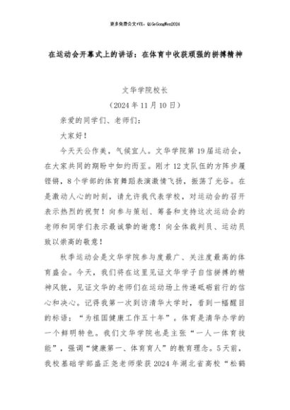 【七哥公文】2024年:在运动会开幕式上的讲话:在体育中收获顽强的拼搏精神+更多免费公文+VX:QiGeGongWen2024