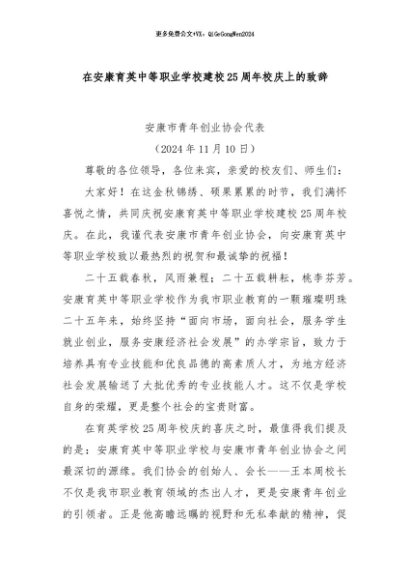 / 【七哥公文】2024年:在安康育英中等职业学校建校25周年校庆上的致辞+更多免费公文+VX:QiGeGongWen2024