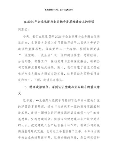 / 【七哥公文】2024年:在2024年企业党建与业务融合发展推进会上的讲话+更多免费公文+VX:QiGeGongWen2024
