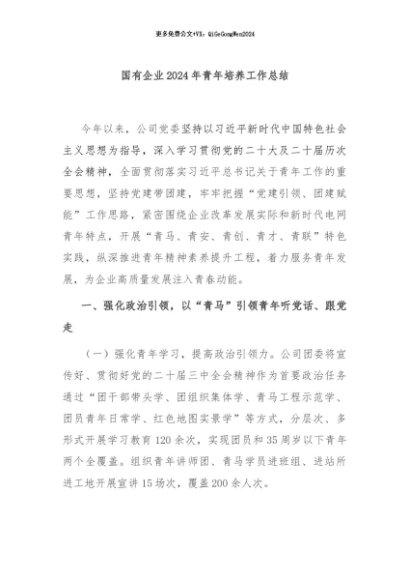 / 【七哥公文】2024年:国有企业2024年青年培养工作总结+更多免费公文+VX:QiGeGongWen2024