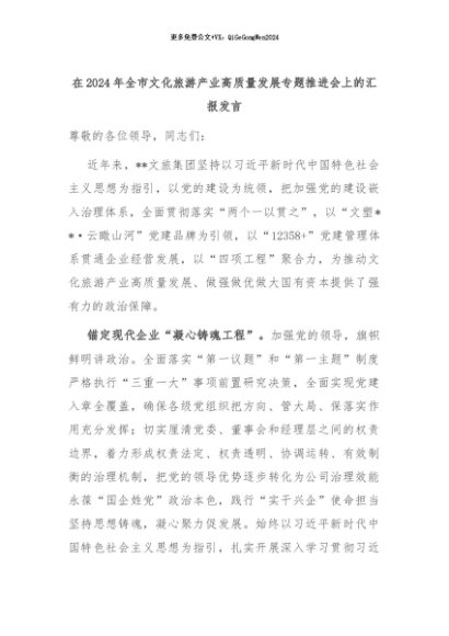 【七哥公文】2024年:在2024年全市文化旅游产业高质量发展专题推进会上的汇报发言+更多免费公文+VX:QiGeGongWen2024