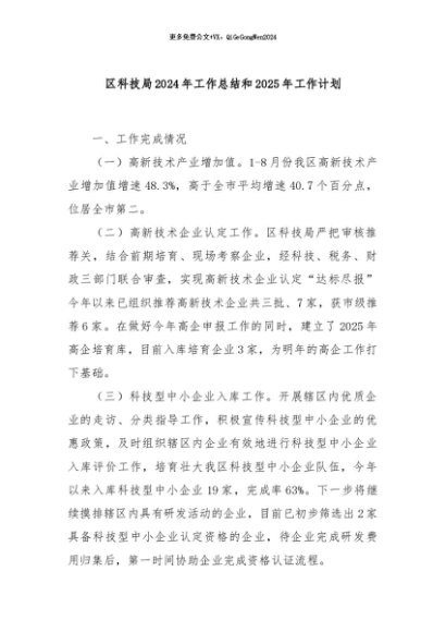 / 【七哥公文】2024年:区科技局2024年工作总结和2025年工作计划+更多免费公文+VX:QiGeGongWen2024