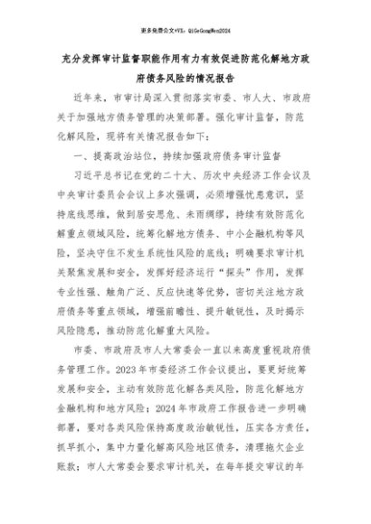 【七哥公文】2024年:充分发挥审计监督职能作用有力有效促进防范化解地方政府债务风险的情况报告+更多免费公文+VX:QiGeGongWen2024