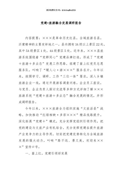 / 【七哥公文】2024年:党建+旅游融合发展调研报告+更多免费公文+VX:QiGeGongWen2024