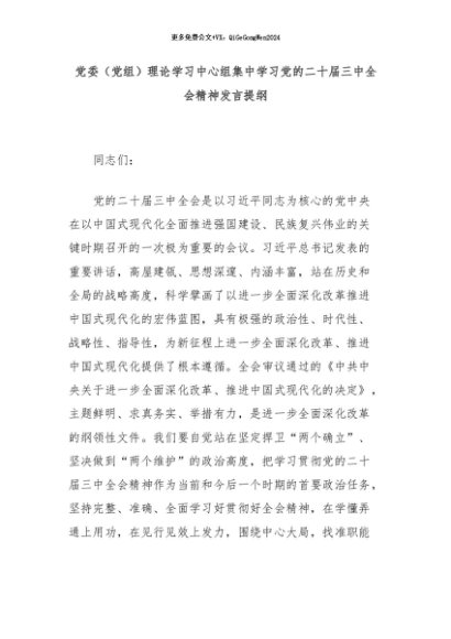 【七哥公文】2024年:党委(党组)理论学习中心组集中学习党的二十届三中全会精神发言提纲+更多免费公文+VX:QiGeGongWen2024