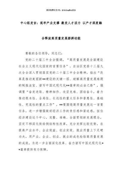 【七哥公文】2024年:中心组发言:筑牢产业支撑 激发人才活力 以产才深度融合释放高质量发展澎湃动能+更多免费公文+VX:QiGeGongWen2024