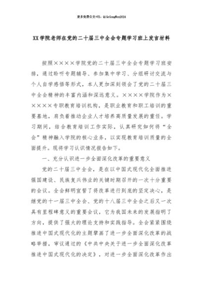 【七哥公文】2024年:XX学院老师在党的二十届三中全会专题学习班上发言材料+更多免费公文+VX:QiGeGongWen2024