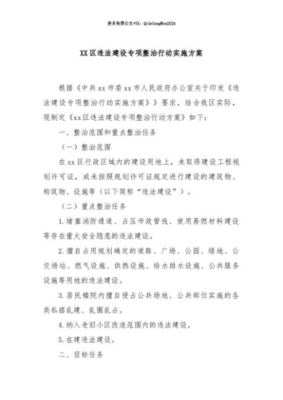 / 【七哥公文】2024年:XX区违法建设专项整治行动实施方案+更多免费公文+VX:QiGeGongWen2024