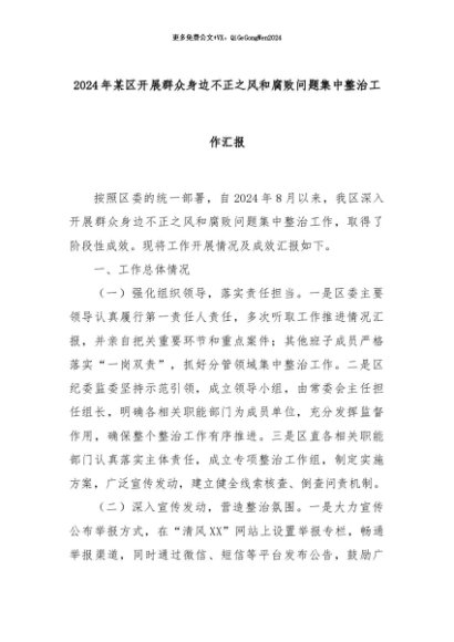【七哥公文】2024年:2024年某区开展群众身边不正之风和腐败问题集中整治工作汇报+更多免费公文+VX:QiGeGongWen2024