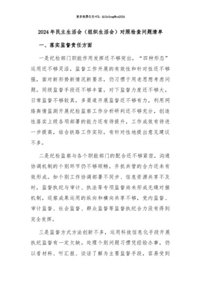 【七哥公文】2024年:2024年民主生活会(组织生活会)对照检查问题清单+更多免费公文+VX:QiGeGongWen2024