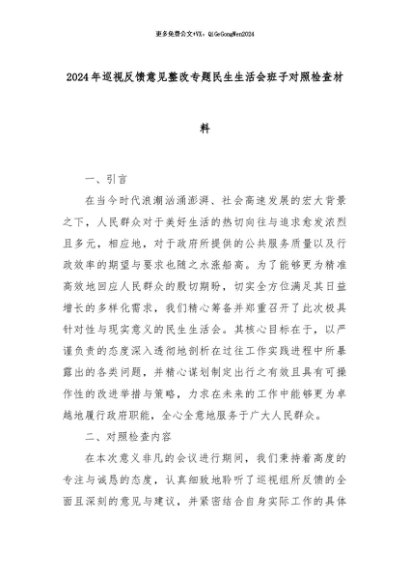 【七哥公文】2024年:2024年巡视反馈意见整改专题民生生活会班子对照检查材料+更多免费公文+VX:QiGeGongWen2024