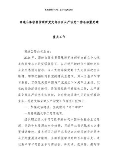 【七哥公文】2024年:高速公路收费管理所党支部全面从严治党工作总结暨党建重点工作+更多免费公文+VX:QiGeGongWen2024