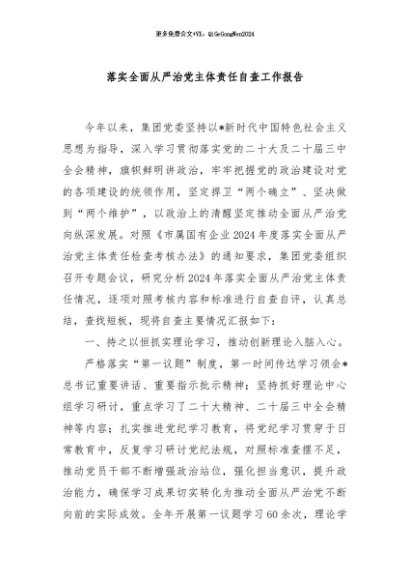 / 【七哥公文】2024年:落实全面从严治党主体责任自查工作报告+更多免费公文+VX:QiGeGongWen2024