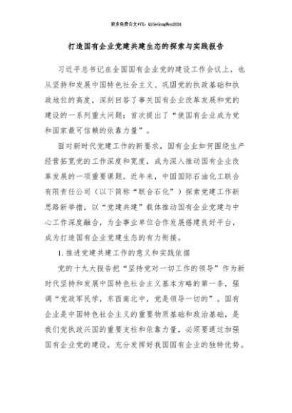 / 【七哥公文】2024年:打造国有企业党建共建生态的探索与实践报告+更多免费公文+VX:QiGeGongWen2024