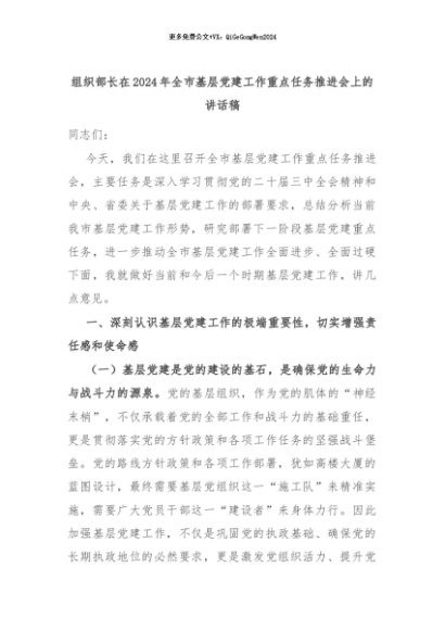 【七哥公文】2024年:组织部长在2024年全市基层党建工作重点任务推进会上的讲话稿+更多免费公文+VX:QiGeGongWen2024