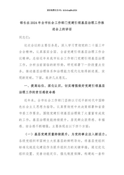 【七哥公文】2024年:部长在2024年全市社会工作部门党建引领基层治理工作推进会上的讲话+更多免费公文+VX:QiGeGongWen2024