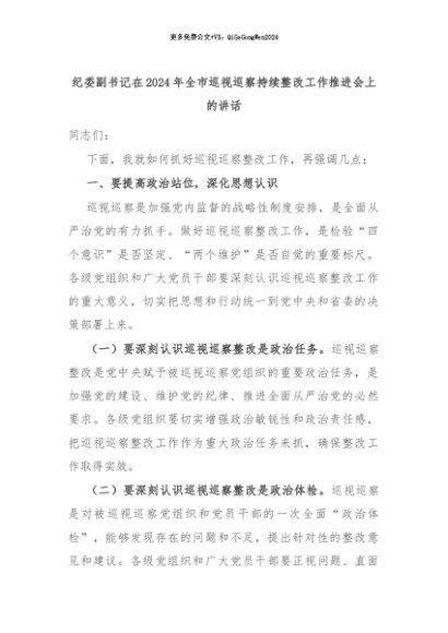 【七哥公文】2024年:纪委副书记在2024年全市巡视巡察持续整改工作推进会上的讲话+更多免费公文+VX:QiGeGongWen2024