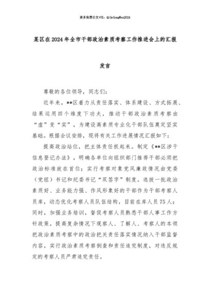 【七哥公文】2024年:某区在2024年全市干部政治素质考察工作推进会上的汇报发言+更多免费公文+VX:QiGeGongWen2024