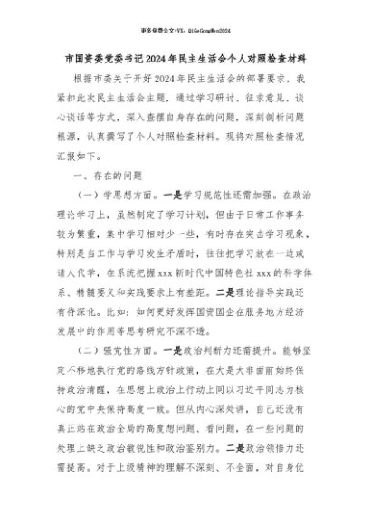 【七哥公文】2024年:市国资委党委书记2024年民主生活会个人对照检查材料+更多免费公文+VX:QiGeGongWen2024