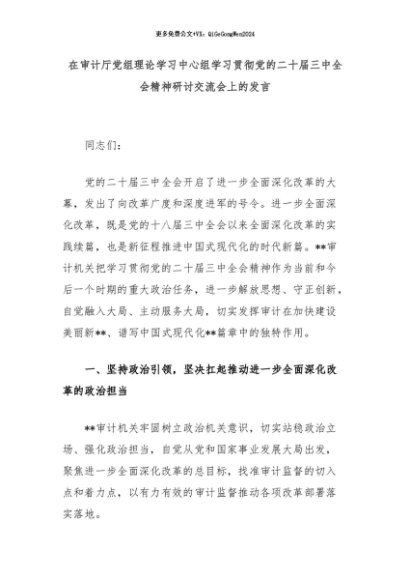 【七哥公文】2024年:在审计厅党组理论学习中心组学习贯彻党的二十届三中全会精神研讨交流会上的发言+更多免费公文+VX:QiGeGongWen2024