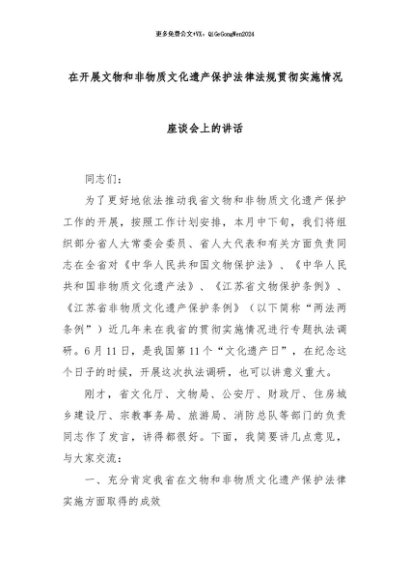 【七哥公文】2024年:在开展文物和非物质文化遗产保护法律法规贯彻实施情况座谈会上的讲话+更多免费公文+VX:QiGeGongWen2024