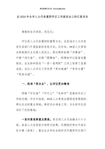 【七哥公文】2024年:在2024年全市人大代表履职评议工作座谈会上的汇报发言+更多免费公文+VX:QiGeGongWen2024