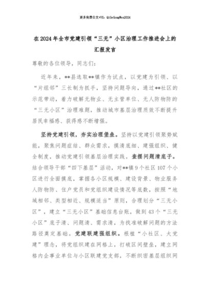【七哥公文】2024年:在2024年全市党建引领“三无”小区治理工作推进会上的汇报发言+更多免费公文+VX:QiGeGongWen2024