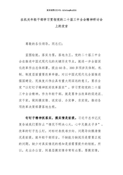 【七哥公文】2024年:在机关年轻干部学习贯彻党的二十届三中全会精神研讨会上的发言+更多免费公文+VX:QiGeGongWen2024
