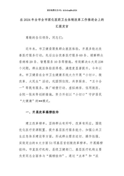 【七哥公文】2024年:在2024年全市全市深化医药卫生体制改革工作推进会上的汇报发言+更多免费公文+VX:QiGeGongWen2024