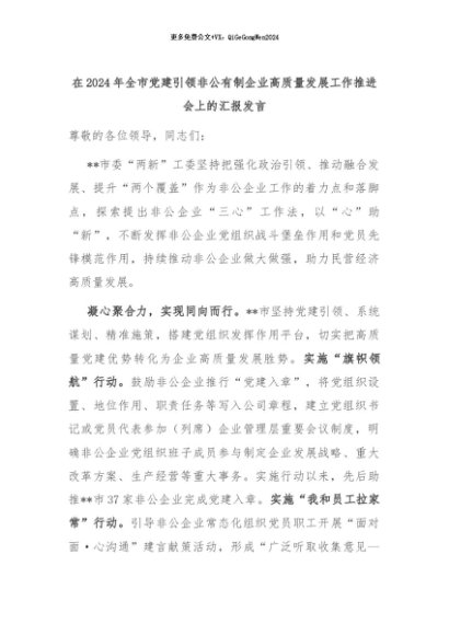 【七哥公文】2024年:在2024年全市党建引领非公有制企业高质量发展工作推进会上的汇报发言+更多免费公文+VX:QiGeGongWen2024