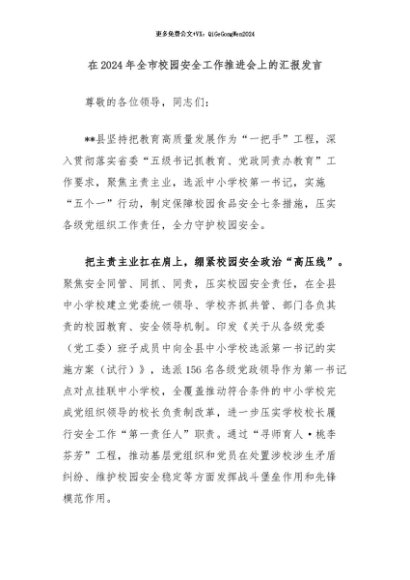 / 【七哥公文】2024年:在2024年全市校园安全工作推进会上的汇报发言+更多免费公文+VX:QiGeGongWen2024