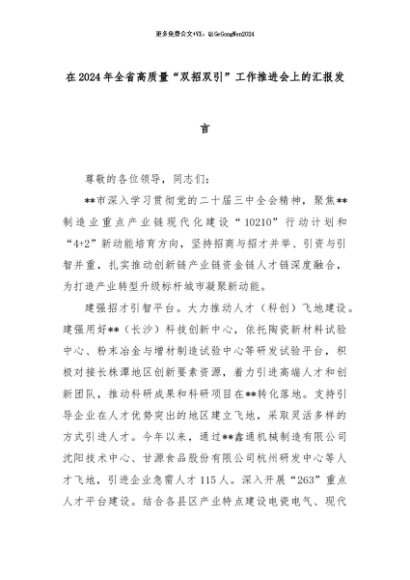 【七哥公文】2024年:在2024年全省高质量“双招双引”工作推进会上的汇报发言+更多免费公文+VX:QiGeGongWen2024