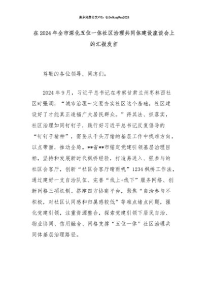 【七哥公文】2024年:在2024年全市深化五位一体社区治理共同体建设座谈会上的汇报发言+更多免费公文+VX:QiGeGongWen2024