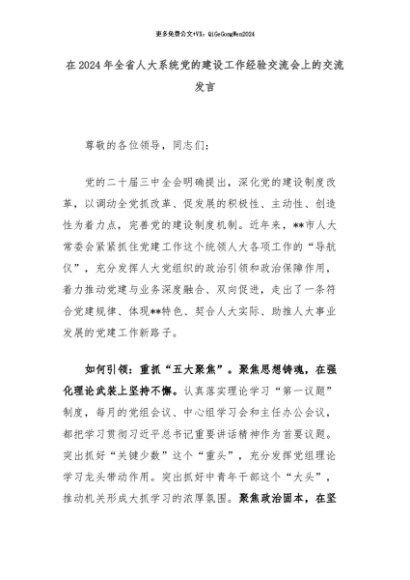 【七哥公文】2024年:在2024年全省人大系统党的建设工作经验交流会上的交流发言+更多免费公文+VX:QiGeGongWen2024