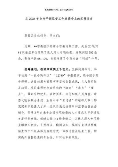/ 【七哥公文】2024年:在2024年全市干部监督工作座谈会上的汇报发言+更多免费公文+VX:QiGeGongWen2024