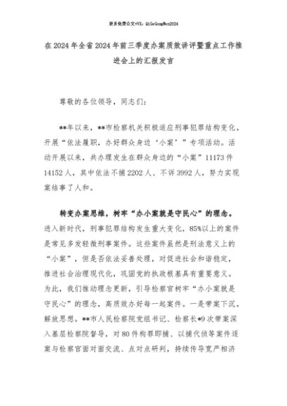 【七哥公文】2024年:在2024年全省2024年前三季度办案质效讲评暨重点工作推进会上的汇报发言+更多免费公文+VX:QiGeGongWen2024